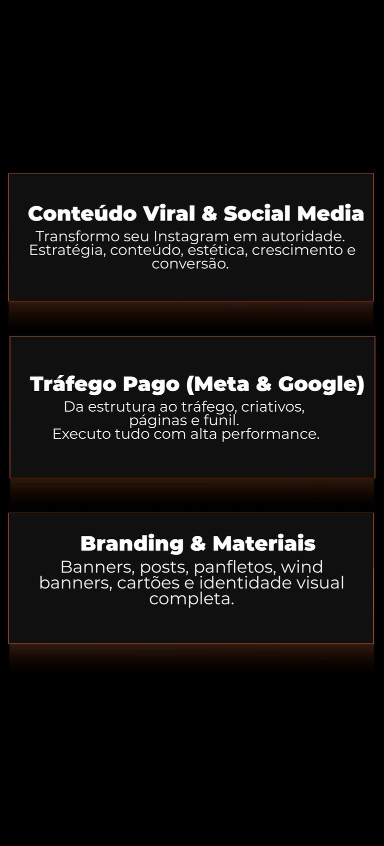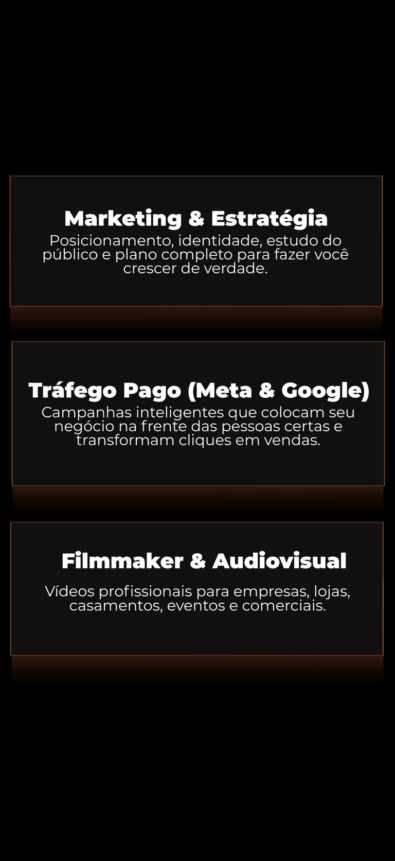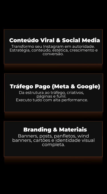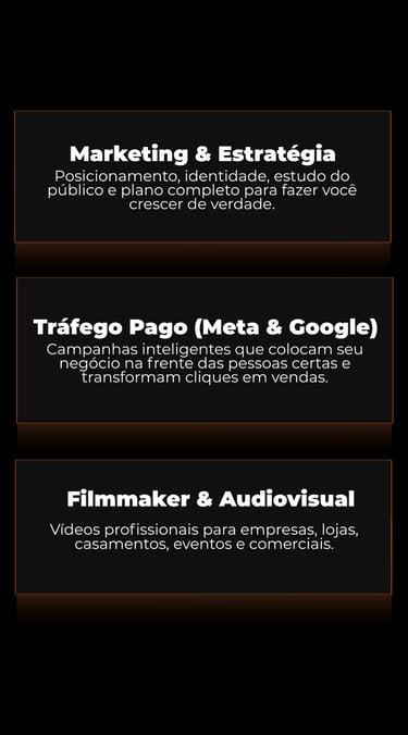 Crio estratégias, produção audiovisual, tráfego pago, sites, lançamentos e tudo que seu negócio precisa para crescer no digital.
